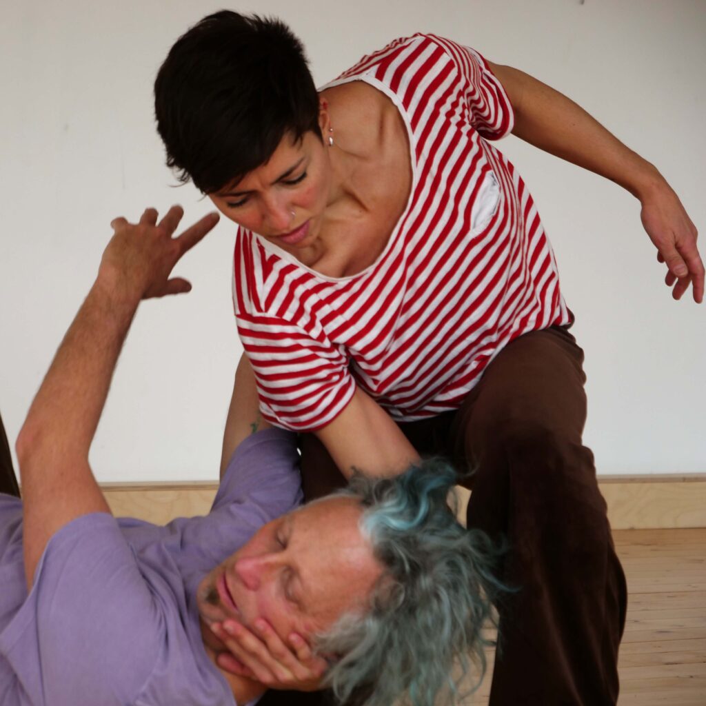 We deconstruct movement and contact into different subject of focus or curiosity: weight, balance and off-balance, proprioceptive sensing, skin/muscle/bone, speed, etc… how does each of these open up a new set of worlds with their own unique ineffable experiences. What is the specific pleasure of the pull of fascia? … of moving together at 1 foot per second? … of maximizing or minimizing surface area in contact? … of the interplay of imaginary worlds and mechanical exploration? How do we then articulate choice of awareness in biomechanical improvisation with other? Seemingly simple or basic invitations open up worlds of complexity.